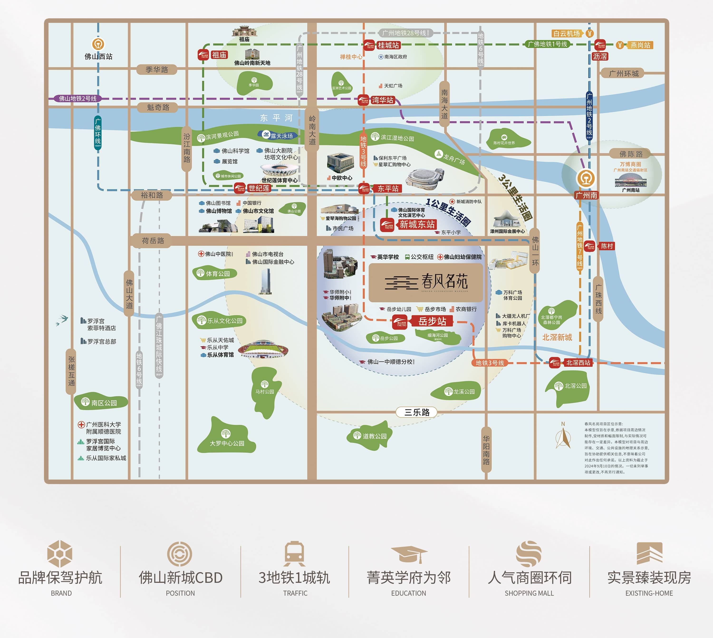 春风名苑由新明珠地产和新城投资联手打造,坐落佛山新城核心圈,享受“九馆六芯”城市名片国际级配套,坐拥立体交通网络,畅享湾区生活圈。项目800米直达广佛线-新城东站,600米近佛山3号线-岳步站,15分钟速达广州南站;1.9km到广佛南线-东平站,1小时通达天河、白云机场等枢纽,通勤无忧。教育资源卓越,800米范围内省一级东平小学、华师附小附中(升学率70%重点中学)及九年制佛山TOP民办英华学校,名校环绕,满足全龄优质教育需求。产品是建面约94-119m²精装三四房,实景现房即买即交付。