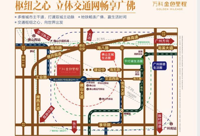 推荐理由:万科金色里程兼享千灯湖、祖庙两大商圈的醇熟配套,附近规划双地铁,佛山地铁3号线(建设中)及佛山地铁5号线(规划中),区位优势得天独厚。