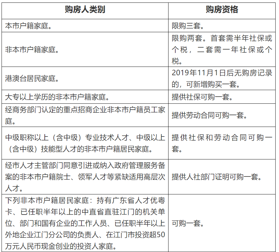 重磅!江门住建局优化限购政策,本地户籍限购三套房!据江门市住建局介绍,本次优化调整是为坚持 “房住不炒”的定位,落实“一城一策”城市主体责任,支持各类外来创新创业人员在我市安居乐业,加大招商引资的成效,加快融入粤港澳大湾区,我局对限购区域内新建商品住房的购房资格作出了部分优化,较新的购房资格政策如下: