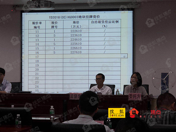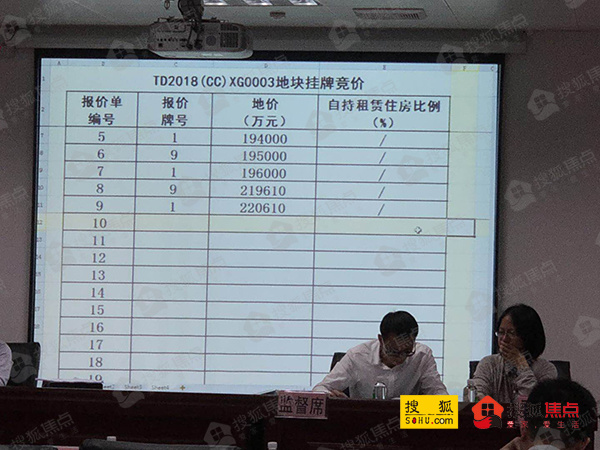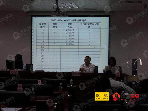 【3:18】 开拍20分钟不到,现场只剩1号及5号房企报价,而且均是主持人报“排名前列次”“第二次”,房企才会举牌。