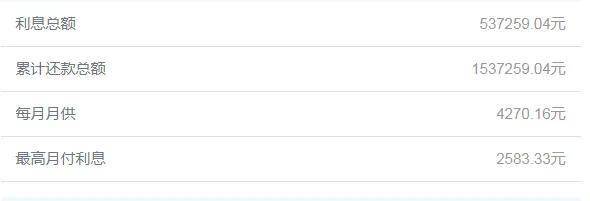 同样是100万贷款,分30年期,3.10% 利率,每月月供4270元,利息总额约53.7万。