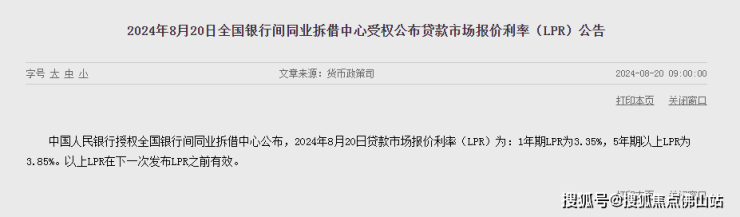 8月20日,中国人民银行授权全国银行间同业拆借中心公布,2024年8月20日贷款市场报价利率(LPR)为:年期LPR为3.35%,5年期以上LPR为3.85%。