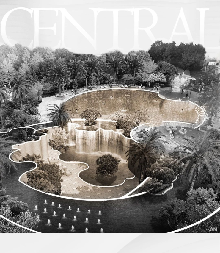 岭南地区丘陵密布,水系众多,在一众自然要素中,水景可谓岭南园林的灵魂。世茂望樾在水景设置上,以现代的手法,将岭南园林中常见的湖景、石潭、瀑布糅合在一起,呈现出极具特色的“曲水流觞”。大堂前的大面积镜面静水,汇聚成一弯喷泉,在大堂后潺潺而出。悬浮式的无边际游泳池,搭配下沉式流水瀑布,气势磅礴,一动一静相映成趣。