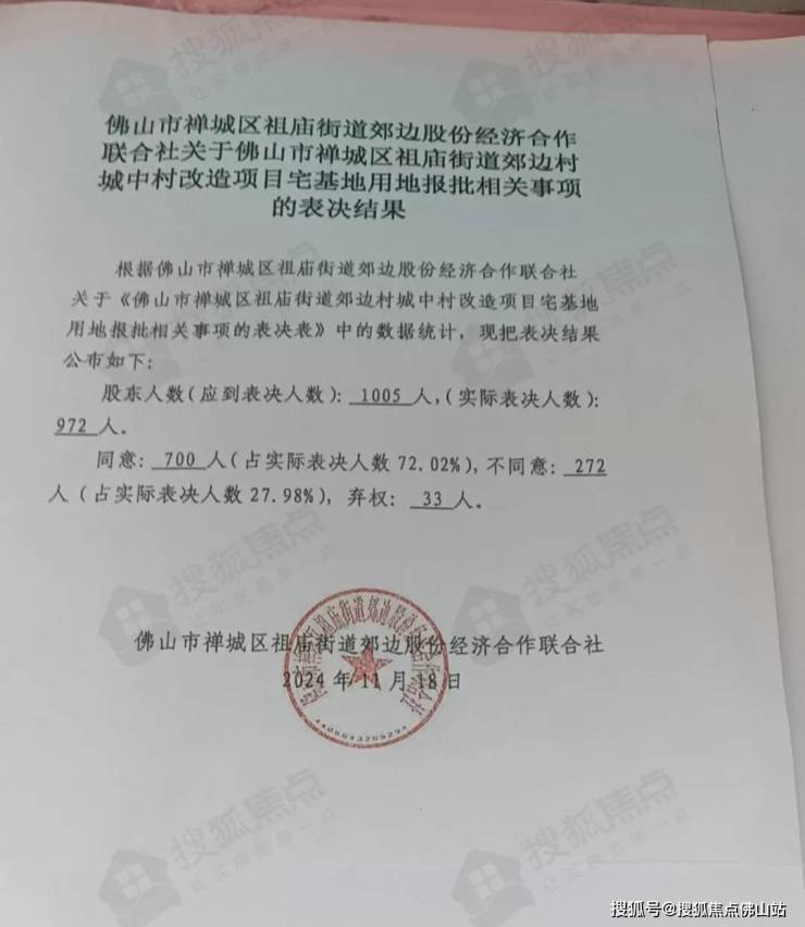 11月16、17日,郊边村开了个股东大会,会议议程为表决《祖庙街道郊边村城中村改造项目用地报批》和 《佛山市禅城区祖庙街道郊边村改造项目拆迁补偿安置方案》 。(以下简称《方案》)。