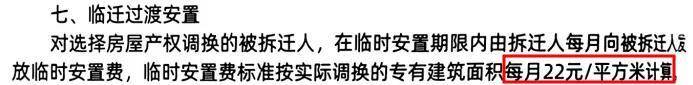 此外,每月可获得22元/㎡的临时安置费,也就是说如果租一套100㎡房子,每月租金补偿是2200元,基本可以覆盖租金支出,另外搬迁费补偿20元/㎡。