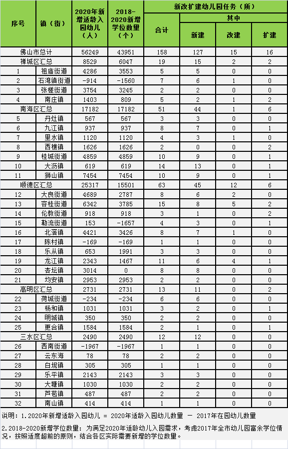 到2020年,佛山预计全市适龄幼儿入园人数新增5.6万人,结合目前幼儿园富余学位情况,按照适度超前原则,新增学位4.4万个。预计全市新改扩建幼儿园158所,其中新建127所,改扩建31所。