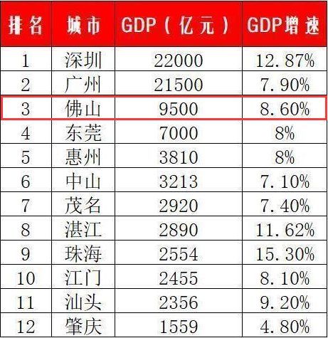 2017年佛山GDP总量9500亿元,增长8.5%,2018年佛山GDP增幅目标8%,预计2018年佛山GDP总量将破万亿,成为广东第三个进入“万亿俱乐部”的城市。