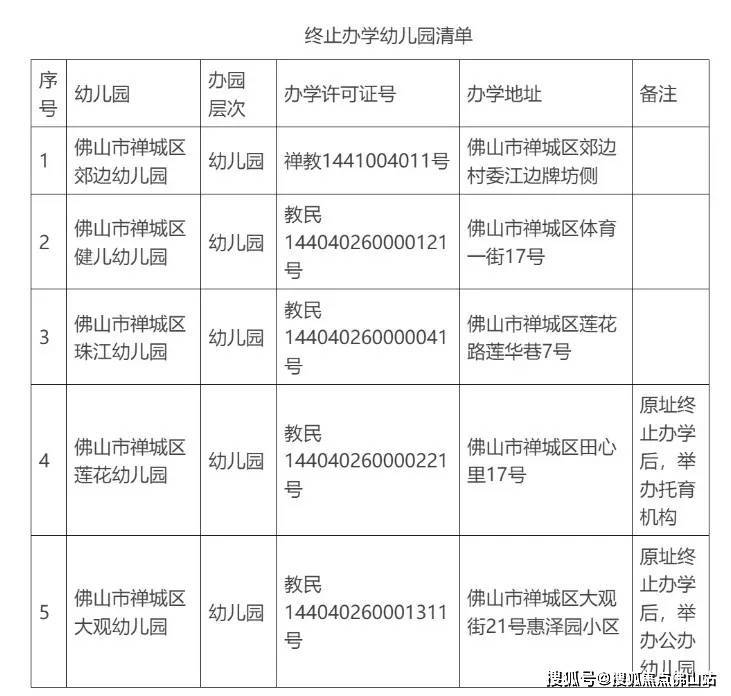 公告称,佛山市禅城区郊边幼儿园、佛山市禅城区健儿幼儿园、佛山市禅城区珠江幼儿园、佛山市禅城区莲花幼儿园 和佛山市禅城区祖庙街道大观幼儿园 等5所幼儿园提出终止办学申请,幼儿园师生分流完毕,已无实际招生、办学行为。