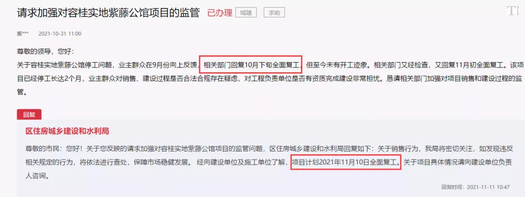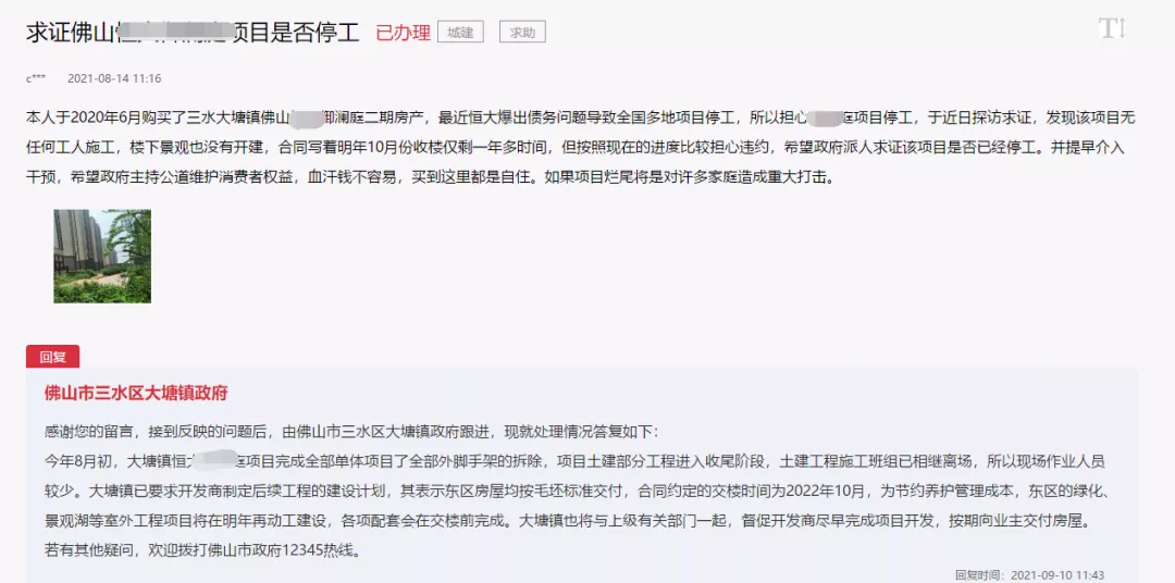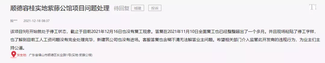 狮山镇政府回复已经采取发提醒函、停工停料、扣诚信分等措施督促建设单位落实资金问题。 措施不少,看来问题还是相当顽固。 另外,实地佛山排名前列项目——实地紫藤公馆从9月开始贴出“停工告示”,被欠薪的工人甚至以跳楼相逼。 该盘早在9月就有业主向相关部门反馈停工问题,得到的是10月下旬复工的消息,但过了约定期限仍未动工。业主再度发问,官方答复为: 经向建设单位及施工单位了解,项目计划2021年11月10日全面复工。