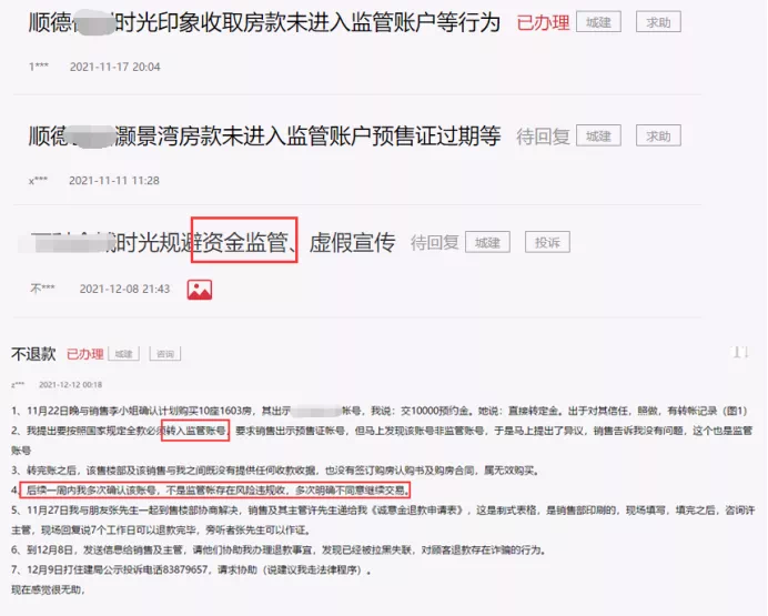 次因:监管不足 制度存在漏洞“难道监管部门就没有一点责任了?” 经常买房的童鞋会注意到,佛山在今年1月7日就开始实行商品房预售款监管,重点内容包括:1、首期款、银行贷款等所有房款全部进入银行监管账户;2、预售款优先保障项目竣工;3、房企不得在监管账户之外收存预售款;4、未达到留存比例,开发商不能申请用款;12月6日,佛山进一步规范商品房销售公示,其中提到:1、应在售楼部明显位置公示预售款专用账户;2、项目不利因素必须公示;相关的监管制度已落实,但讽刺的是,关于“预售款未进入监管账户”、“开发商挪用监管账户资金”等投诉屡屡发生。