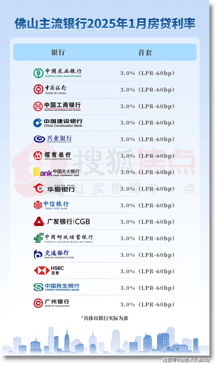 房贷利率: 去年佛山取消房贷利率下限,随后通知房贷利率不低于3.0%,目前佛山各大主流银行最低利率保持在3.0% 。