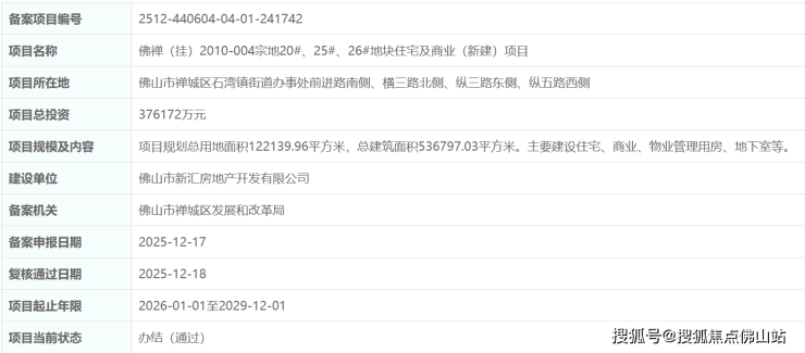 备案资料显示,该项目位于佛山市禅城区石湾镇街道办事处前进路南侧、横三路北侧、纵三路东侧、纵五路西侧,项目规划总用地面积122139.96㎡,总建筑面积536797.03㎡。主要建设住宅、商业、物业管理用房、地下室等。
