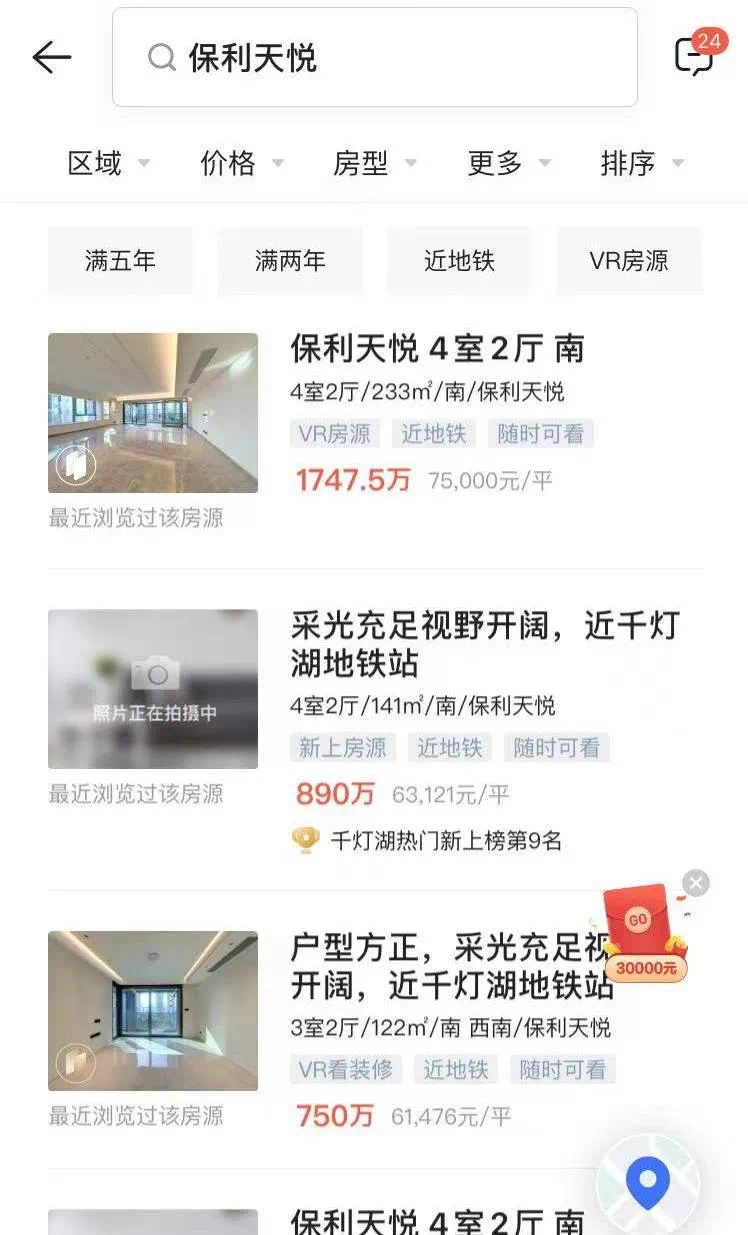 据贝壳平台显示,目前保利天悦已有27套二手房源,面积段约122-143㎡三至五房,主流挂牌价约6.2-7.5万/㎡。