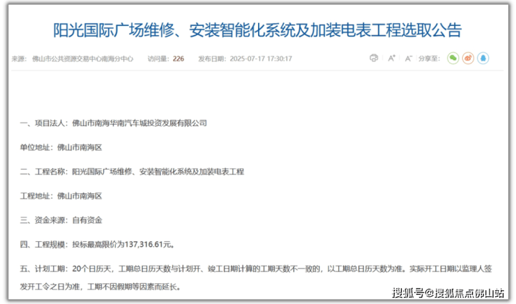 近日,南海区人民政府网站发布一则招标公告,关于阳光国际广场维修、安装智能化系统及加装电表的事宜。