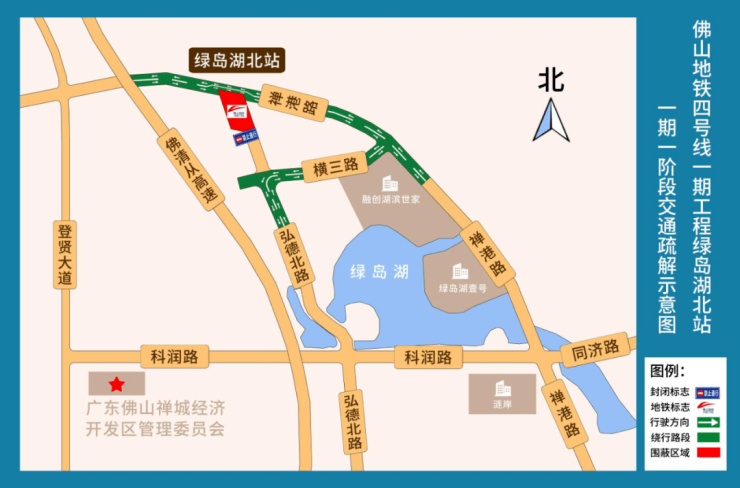 佛山市城市轨道交通4号线一期工程绿岛湖北站车站工程因站位施工范围调整,原占道围蔽空间将依序相应调整。从2022年10月15日零时起,禅港路与弘德北路部分路段将进行围蔽施工,分别为排名前列期排名前列阶段施工工期6个月,排名前列期第二阶段施工工期18个月,围蔽施工总时间约为24个月。