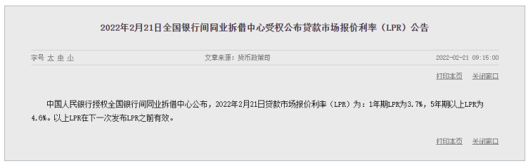 2月21日,中国人民银行授权全国银行间同业拆借中心公布,2022年2月21日贷款市场报价利率(LPR)为:1年期LPR为3.70%,此前为3.70%,5年期以上LPR为4.60%,此前为4.60%。