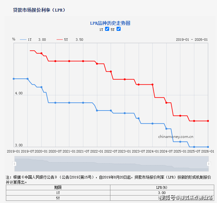 中国人民银行授权全国银行间同业拆借中心公布,2026年1月20日,贷款市场报价利率(LPR)为:1年期LPR为3.00%,5年期以上LPR为3.50%,均较上月保持不变,以上LPR在下一次发布LPR之前有效。