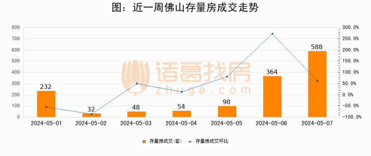 从存量房来看,2024年05月07日佛山存量房单日成交588套,比昨日增加224套,环比上涨61.5%。从近一周存量房成交来看,佛山存量房日均成交套数为202套,05月07日单日成交588套,高于近一周平均水平191.1%。