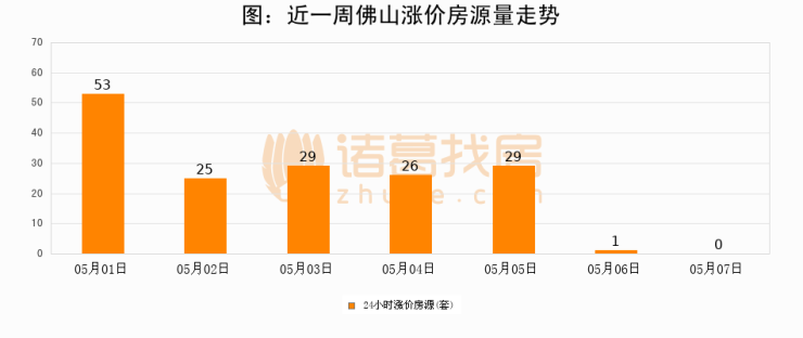 根据诸葛找房数据显示,佛山24小时涨价房源量为0套,较05月06日减少1套,环比下降100%。与此同时,涨价房源占比小幅回落,对于购房者来说是一个入市窗口期,购房者可抓住时机入市。
