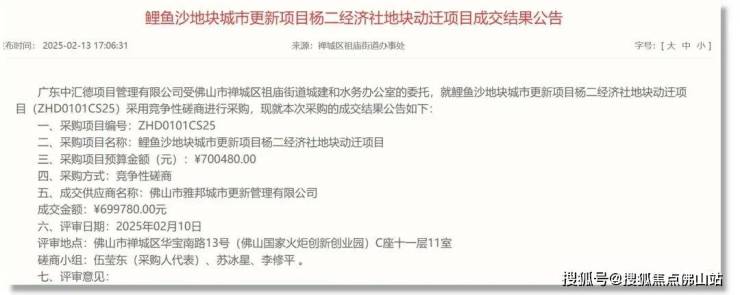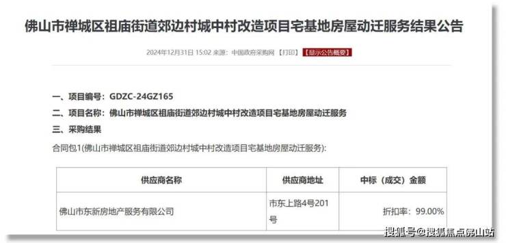 2月13日,禅城区人民政府发布了鲤鱼沙地块 城市更新项目杨二经济社地块动迁项目成交结果公告。