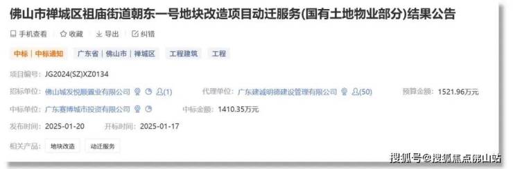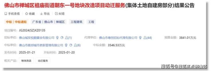 此前,该项目宅基地房屋动迁服务招标已完成,佛山市东新房地产服务有限公司最终中标,总预算超5815.85万 。