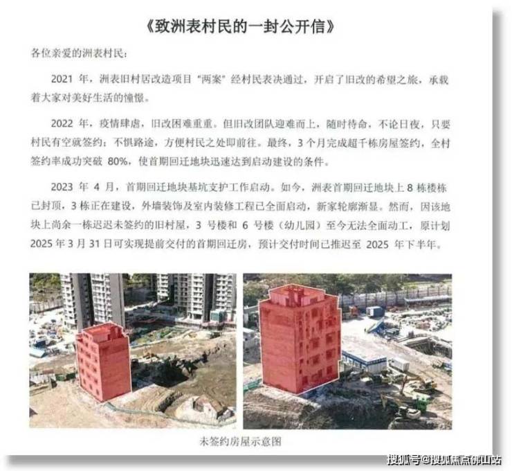 去年年底,《致洲表村民的一封公开信》中提到,首期回迁房地块上有1栋旧村屋 仍未签约,3号楼和6号楼(幼儿园)至今无法全面动工。