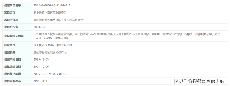 近日,萝卜快跑华南运营总部项目已正式备案,总投资1800万元。