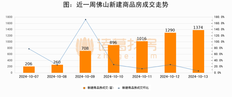 根据佛山市住房保障和房产信息网数据显示,2024年10月13日佛山新建商品房成交1374套,较昨日增加84套,环比上涨6.5%