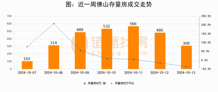 从存量房来看,2024年10月13日佛山存量房单日成交308套,比昨日减少172套,环比下降35.8%。从近一周存量房成交来看,佛山存量房日均成交套数为398套,10月13日单日成交308套,低于近一周平均水平22.6%。