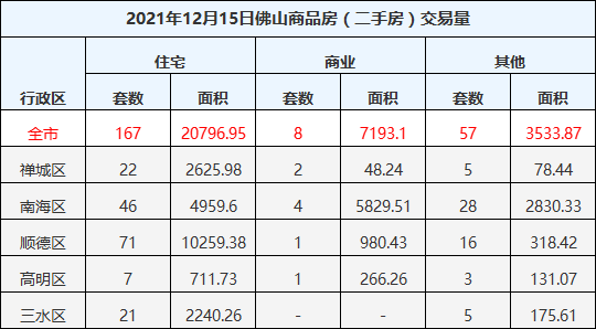 二手住宅成交167套,成交面积20796.95㎡,其中禅城22套,南海46套,顺德区71套,高明区7套,三水区21套。