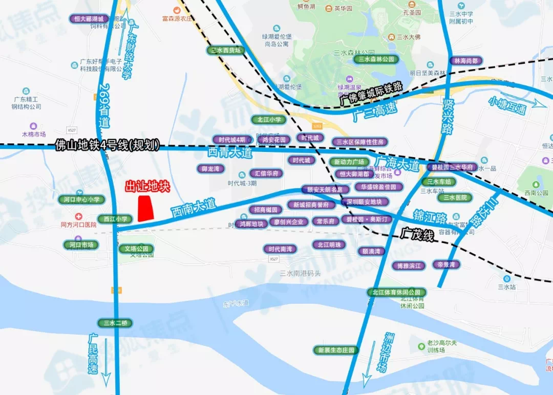 从地图上看,地块位处269省道和西南大道交汇处,地属西南河口片区,邻近三水二桥,西侧为西江小学,与文塔公园仅一路之隔。