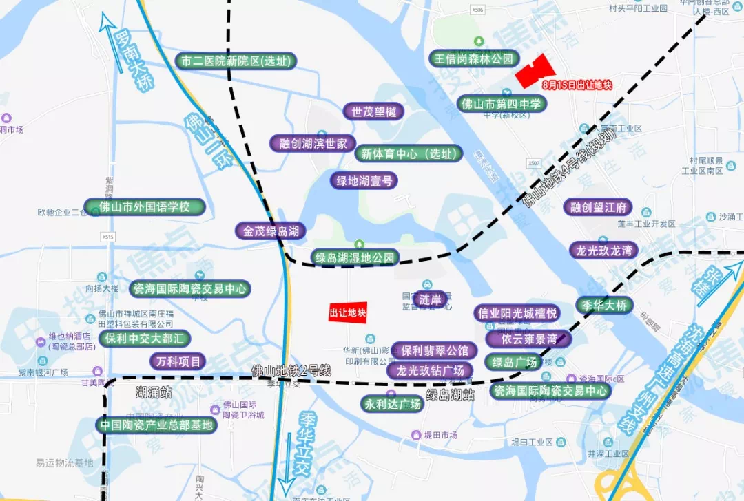 从地图上看,该地块靠近季华西路,可通过季华大桥接驳季华路向东快速通往禅城和桂城中心。同时,地块与在建中的佛山地铁2号线绿岛湖站相距不到700米,待地铁开通后,从地块出发坐地铁可快速直达广州南站。