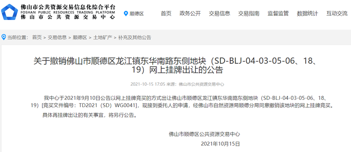 10月15日,从佛山市公共资源交易网获悉,原定于10月20日进行网拍的顺德龙江超12万㎡商住地,因接到委托人申请,现终止出让。