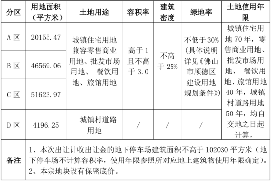 根据文件显示,宗地占地122544.75㎡,分A、B、C、D四个区域规划,其中D区为城镇村道用地,占地4196.25㎡建设投资不低于283万元;A、B、C区为住宅用地兼容商业,容积率大于1.0且小于3.0,建筑密度<25%,绿地里>30%,限高80米。