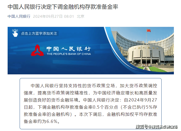 中国人民银行9月27日宣布,决定自2024年9月27日起,下调金融机构存款准备金率0.5个百分点(不含已执行5%存款准备金率的金融机构)。本次下调后,金融机构加权平均存款准备金率约为6.6%。