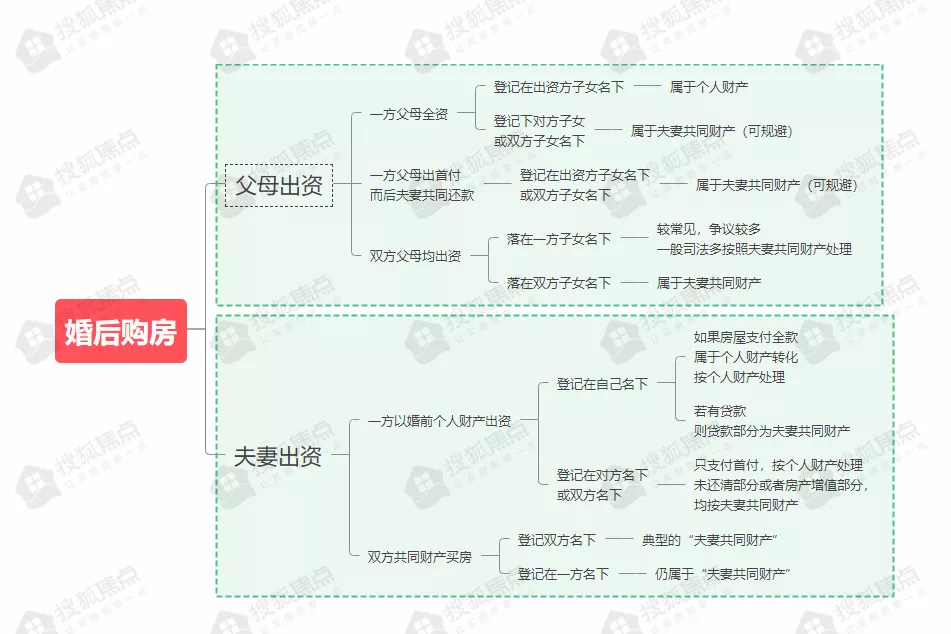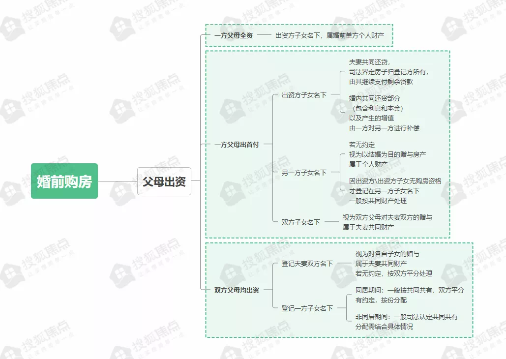婚前购房主要细分为:父母出资和夫妻出资两种;而这两种情况下面又分别具体细分为:一方出资,一方出首付,双方出资等情况,