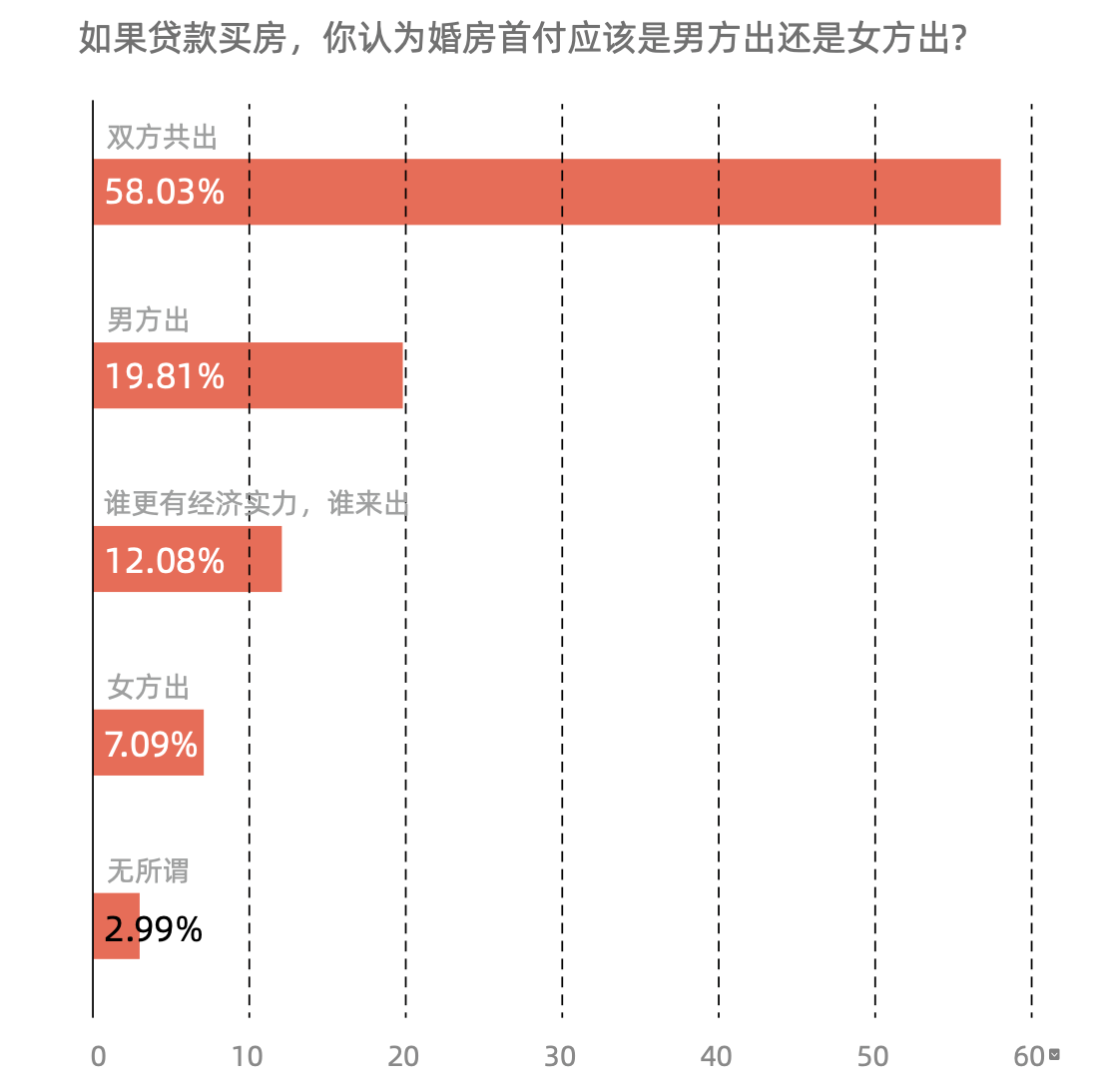随着社会发展,性别平等的内涵更加丰富,度量也延伸至家庭财产。在人格与经济都走向独立的时代,女性对待结婚买房态度如何?“双方共同出资”成为女性主流态度,58.03%的女性认可双方共同完成首付。一直以来,男性结婚买房压力更大,19.81%的女性认为买房首付款应由男方出资,7.09%的女性认为可以女方自己来付首付。