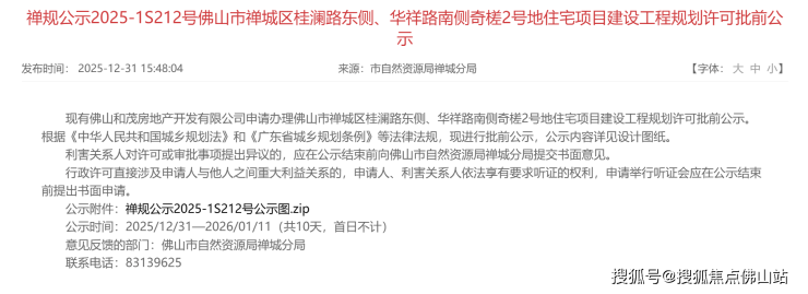 近日,佛山市自然资源局禅城分局发布佛山市禅城区桂澜路东侧、华祥路南侧奇槎2号地住宅项目建设工程规划许可批前公示。
