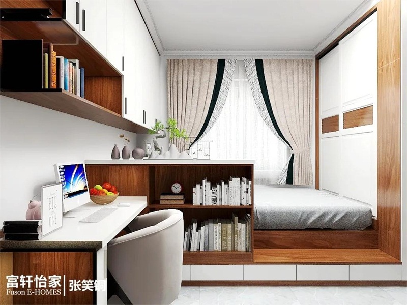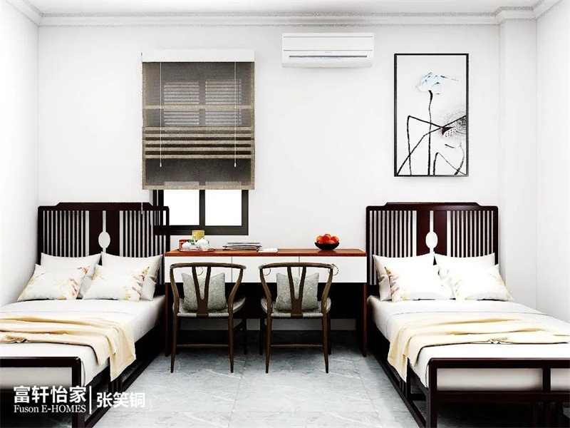△两张床、一张双人书桌、一个落地衣柜,无需过多的装饰,去繁化简,用简洁的设计让生活回归本真的模样。