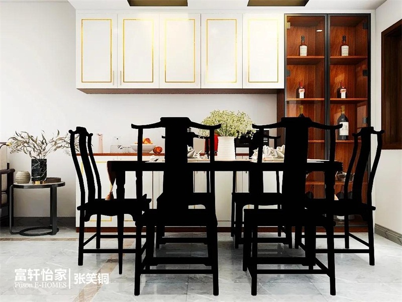 △餐厅具备浓厚的中式氛围,黑色仿古实木餐桌,沉稳大气;胡桃木色+玻璃元素的酒柜,复古有韵味,为一家人营造舒适的用餐氛围。