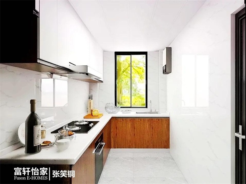 △L型厨房布局,洗、切、炒、上菜流水线操作,下厨轻松;墙面、地面铺浅色系砖,整体空间整洁透亮,不挂油的釉面瓷砖,清洁更省心。