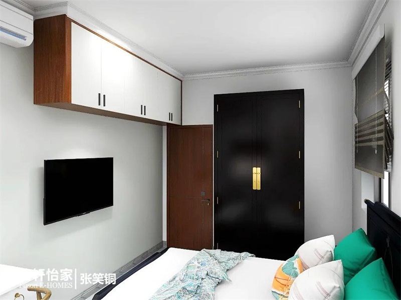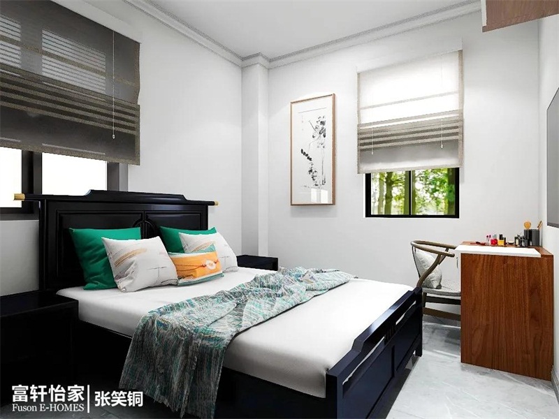 △主卧有两扇窗户,白天采光充足;用百叶窗代替传统厚实的窗帘,空间更具轻盈感;黑色实木双人床,复古有质感。