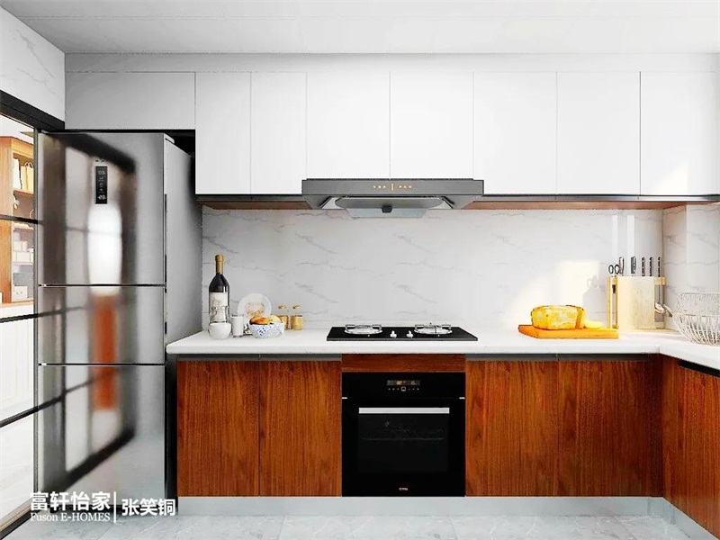 △冰箱与洗碗机嵌入橱柜中,为下厨留出更多活动空间;整体延续玄关的风格,胡桃木地柜、乳白色吊柜,简洁有格调。