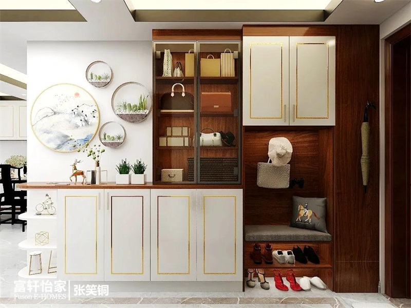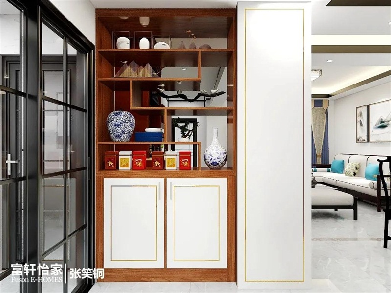 △半通透的隔断柜,用于划分客厅与玄关,镂空部分展示屋主珍藏的瓷器、茶叶,封闭部分可收纳一些日常小零碎用品。