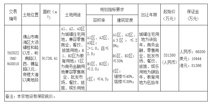 根据公示可知,地块位于大沥镇桂和路以东、岭南路以西、穗盐路以北、奇槎大道以南地段,总占地91736.41㎡,须1年内动工,4年内竣工。