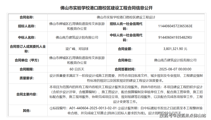公告显示,该项目合作方为佛山南方建筑设计院有限公司,合同金额为380.13万元。