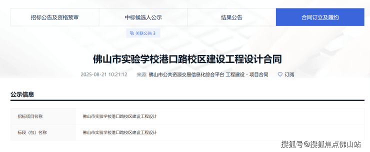 8月21日,广东省公共资源交易中心发布佛山市实验学校港口路校区建设工程设计合同。
