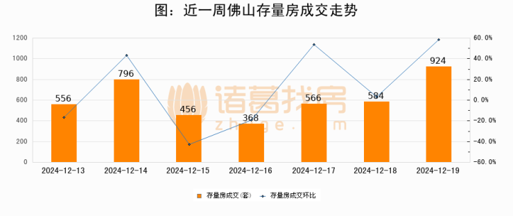 从存量房来看,2024年12月19日佛山存量房单日成交924套,比昨日增加340套,环比上涨58.2%。从近一周存量房成交来看,佛山存量房日均成交套数为607套,12月19日单日成交924套,高于近一周平均水平52.2%。
