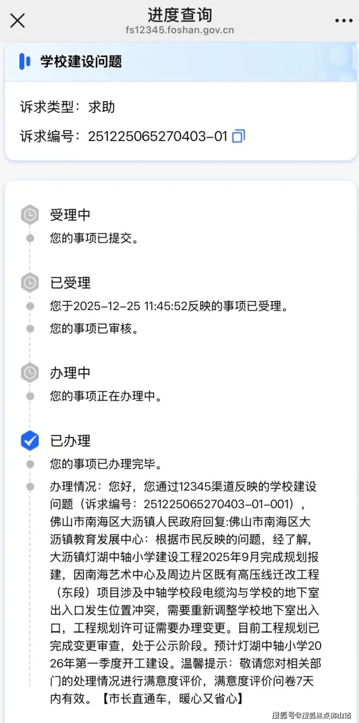 办理情况如下:您好,您通过12345渠道反映的学校建设问题(诉求编号:251225065270403-01-001),佛山市南海区大沥镇人民政府回复:佛山市南海区大沥镇教育发展中心:根据市民反映的问题,经了解,大沥镇灯湖中轴小学建设工程2025年9月完成规划报建,因南海艺术中心及周边片区既有高压线迁改工程(东段)项目涉及中轴学校段电缆沟与学校的地下室出入口发生位置冲突,需要重新调整学校地下室出入口,工程规划许可证需要办理变更。目前工程规划已完成变更审查,处于公示阶段。预计灯湖中轴小学2026年第一季度开工建设。