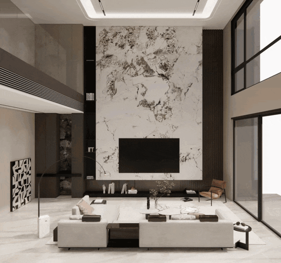 客厅公区也是“度假天地”,中空6.6米挑高,霸气十足,巨大的落地窗引入充足光线,采光通风俱佳。